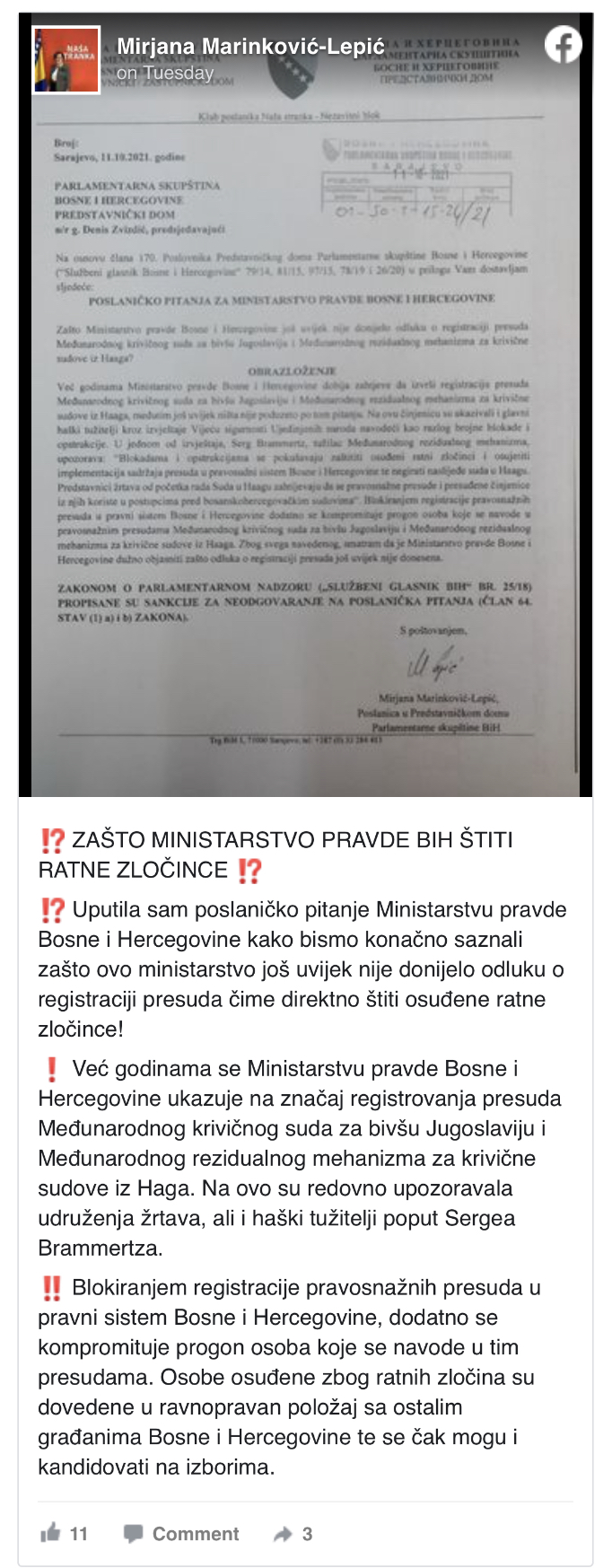 Nedonošenjem odluke o registraciji haških presuda Ministarstvo pravde BiH direktno štiti osuđene ratne zločince. Tvrdi to Mirjana Marinković-Lepić, zastupnica Naše stranke u Parlamentranoj skupštini BiH.