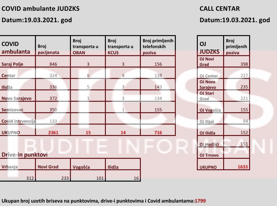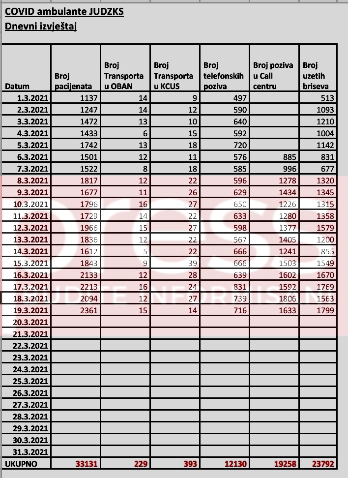 Broj pacijenata koji su primili od početka marta je 33.131, uzetih briseva je 23.792, a broj primljenih poziva u uspostavljenom Call-centru je 19.252.