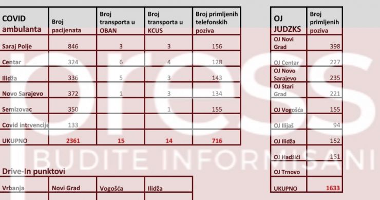 Broj pacijenata koji su primili od početka marta je 33.131, uzetih briseva je 23.792, a broj primljenih poziva u uspostavljenom Call-centru je 19.252.