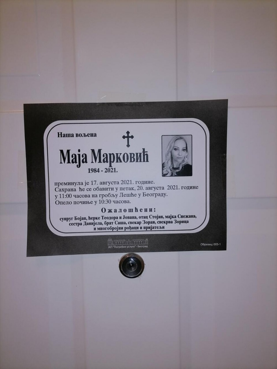 Pripadnica MUP Maja Marković (37) iz Beograda, koja je tragično nastradala kad ju je udarila struja na terasi njenog stana dok je namještala kabl na računarima kojima je “rudarila” kriptovalutu itirijum, biće sutra sahranjena.