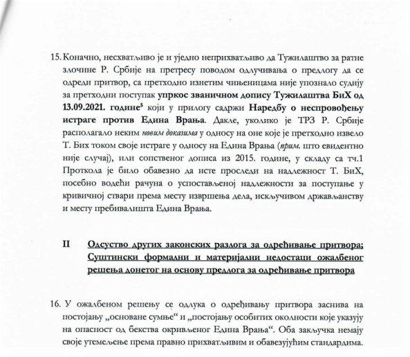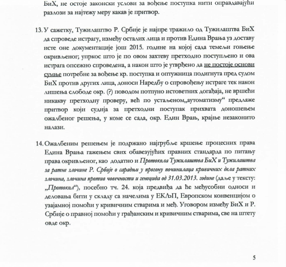 Takođe, branilac Zorko u Žalbi podsjeća da je Tužilaštvo Republike Srbije, uz dostavu dokumentacije, još 2015. godine, najprije od Tužilaštva BiH, zatražilo da sprovede istragu, između ostalih, i za Edina Vranja. Tužilaštvo BiH je to i uradilo i odbacilo optužbe koje su se odnosile na Vranja. Međutim, srbijansko tužilaštvo, nakon Vranjevog hapšenja, poseglo je za istom dokumentacijom, „iako je ustanovljeno da ne postoje osnovi sumnje potrebne za vođenje krivičnog postupka“. Zorko dalje navodi da je „po automatizmu predložen pritvor, što je sudija za prethodni predmet prihvatio donošenjem Ožalbenog rješenja kojim je podržano najgrublje kršenje procesnih prava Edina Vranja“.