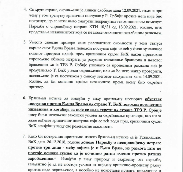 Osim ovoga, advokat odbrane iznosi još dokaza i činjenica kojima u potpunosti pobija sve navode srbijanskog tužilaštva u odnosu na odgovornost Edina Vranja te, faktički, upućuje da je njegov boravak u pritvoru nelegalan i nezakonit te da su mu u potpunosti pogažena ljudska prava.