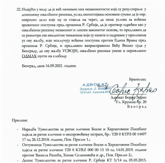 U svom obrazloženju branilac Zorko navodi da je “Ožalbeno rješenje drastično nezakonito, protivno zakonu i Ustavu Republike Srbije, ustanovljenim principima i standardima, te da je cijeli proces kršenje elementarnih krivično-pravnih principa koji su garant zakonitosti krivičnog postupka“.