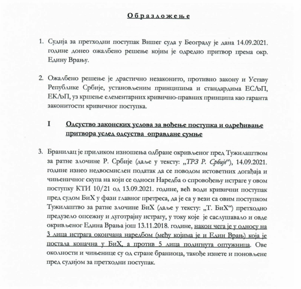 Žalba se odnosi na Rješenje sudije za prethodni postupak Višeg suda u Beogradu. Podsjećamo, sudija za prethodni postupak ovog Suda ranije je Vranju odredio jednomjesečni pritvor zbog, kako se navodi u ovom dokumentu, „mogućnosti bijega“.