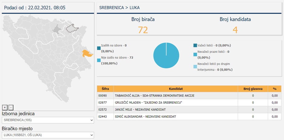 Takav je slučaj u mjestu Luka. Prema podacima Centralne izborne komisije, u ovom mjestu registrirana su 72 glasača, ali niko od njih nije izašao na izbore, pa je očito da je bojkot urodio plodom.