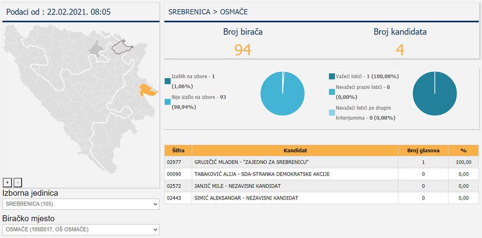 Slična je stvar u mjestu Osmače, gdje su registrirana 94 birača, ali je svoje pravo ostvario samo jedan koji je glasao za Mladena Grujićića, kandidata koalicije “Zajedno za Srebrenicu”.