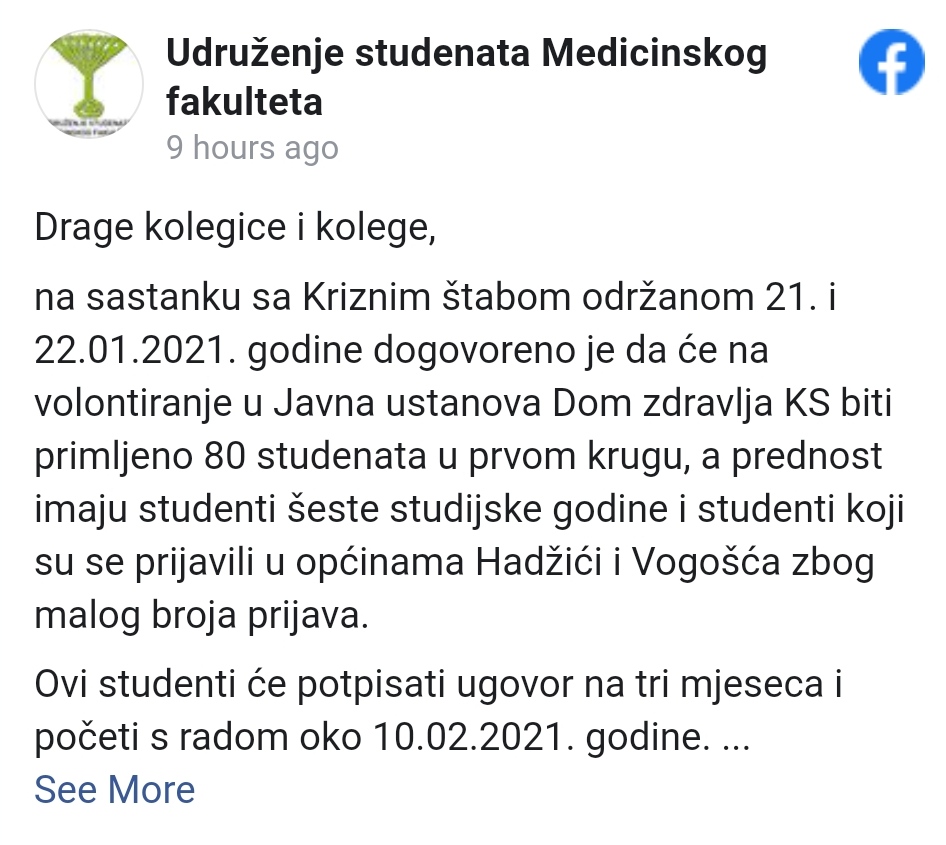 “Na sastanku sa Kriznim štabom održanom 21. i 22.01.2021. godine dogovoreno je da će na volontiranje u Javna ustanova Dom zdravlja KS biti primljeno 80 studenata u prvom krugu, a prednost imaju studenti šeste studijske godine i studenti koji su se prijavili u općinama Hadžići i Vogošća zbog malog broja prijava”, naveli su u saopćenju.