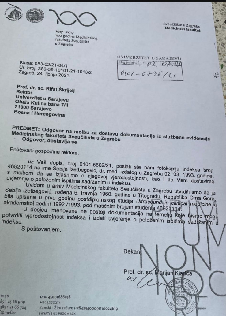 U međuvremenu, inspekciji su proslijeđeni podaci rektora UNSA-e koji su stigli iz Zagreba, a u kojima se navodi da ne postoji dokumentacija na osnovu koje bi mogli potvrditi vjerodostojnost indeksa i izdati uvjerenje o položenim ispitima Sebije Izetbegović u ovoj visokoškolskoj ustanovi.