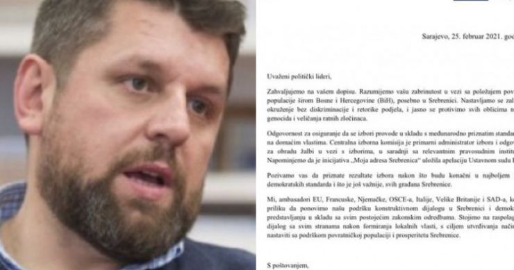 U njemu su se ambasadori, između ostalog, “zahvalili na dopisu” i naveli kako “razumiju zabrinutost u vezi s položajem povratničke populacije širom BiH, posebno u Srebrenici”, te istaknuli kako se “nastavljaju zalagati za okruženje bez diskriminacije i retorike podjela i jasno se protive svim oblicima negiranja genocida i veličanja ratnih zločina”.