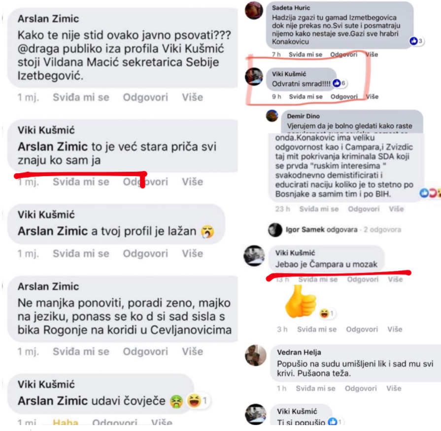 Gdje je i šta toliko mogla zgriješiti Vildana Kušmić, uposlenica KCUS-a, sekretarica prof. Sebije Izetbegović, odana i vijerna, uvijek spremna uputiti onima koji nisu istomišljenici njene šefice najvulgarnije komentare?
