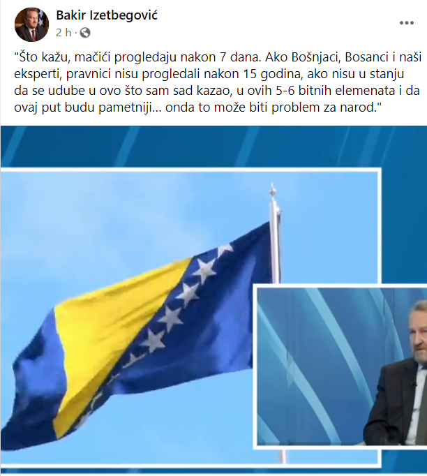 “Što kažu, mačići progledaju nakon 7 dana. Ako Bošnjaci, Bosanci i naši eksperti, pravnici nisu progledali nakon 15 godina, ako nisu u stanju da se udube u ovo što sam sad kazao, u ovih 5-6 bitnih elemenata i da ovaj put budu pametniji… onda to može biti problem za narod”, rekao je Izetbegović.