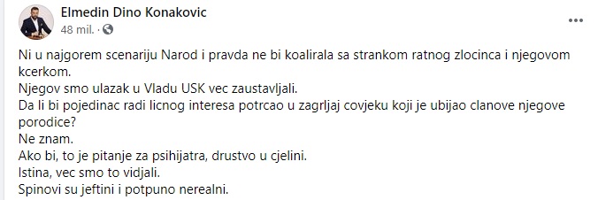 “Ni u najgorem scenariju Narod i pravda ne bi koalirala sa strankom ratnog zločinca i njegovom kćerkom. Njegov smo ulazak u Vladu USK već zaustavljali. Da li bi pojedinac radi ličnog interesa potrčao u zagrljaj čovjeku koji je ubijao članove njegove porodice? Ne znam. Ako bi, to je pitanje za psihijatra, drustvo u cjelini. Istina, vec smo to vidjali. Spinovi su jeftini i potpuno nerealni”, napisao je Konaković.