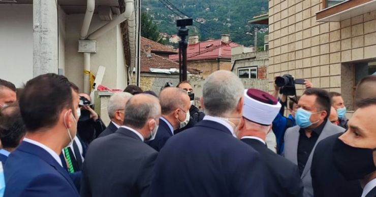Tokom posjete Kovačima gdje je odao počast šehidima i prvom predsjedniku Predsjedništva BiH, Aliji Izetbegovića, grupa građana Sarajeva fotografirala se s turskim liderom.