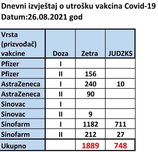 Prvu dozu AstraZenece primilo je 240 građana u Zetri, dok je na ovoj lokaciji 90 osoba revakcinisano istom vakcinom. U domovima zdravlja prvu dozu AstraZenece primilo je 10 građana, dok revakcinisanih nije bilo.