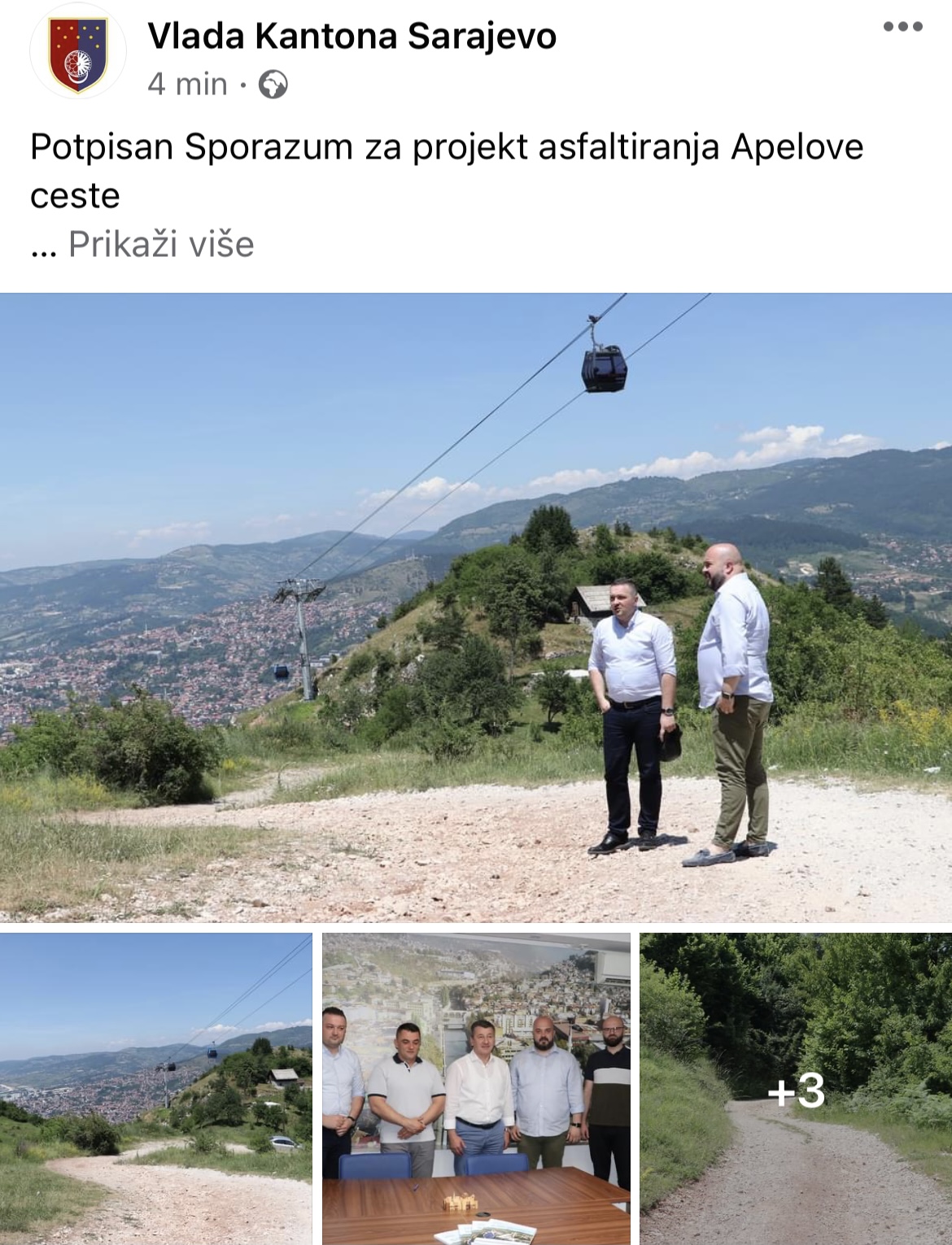 “Apelova cesta predstavlja vezu zaštićenog područja Trebević i gradskog jezgra. Cilj ovog projekta je da se postojeća makadamska trasa rekonstruiše i građanima Sarajeva omogući najkraći put do Trebevića. Dužina trase je oko 900 metara, od ulice Dolovi do urušenih objekata na cilju bob staze. Intenzivno radimo na poboljšanju saobraćajne infrastrukture sa svim općinama na zadovoljstvo svih naših građana. Ovakvi projekti donijet će nam novi podstrek da svi zajedno gradimo još više u Kantonu Sarajevo”, rekao je Šteta.