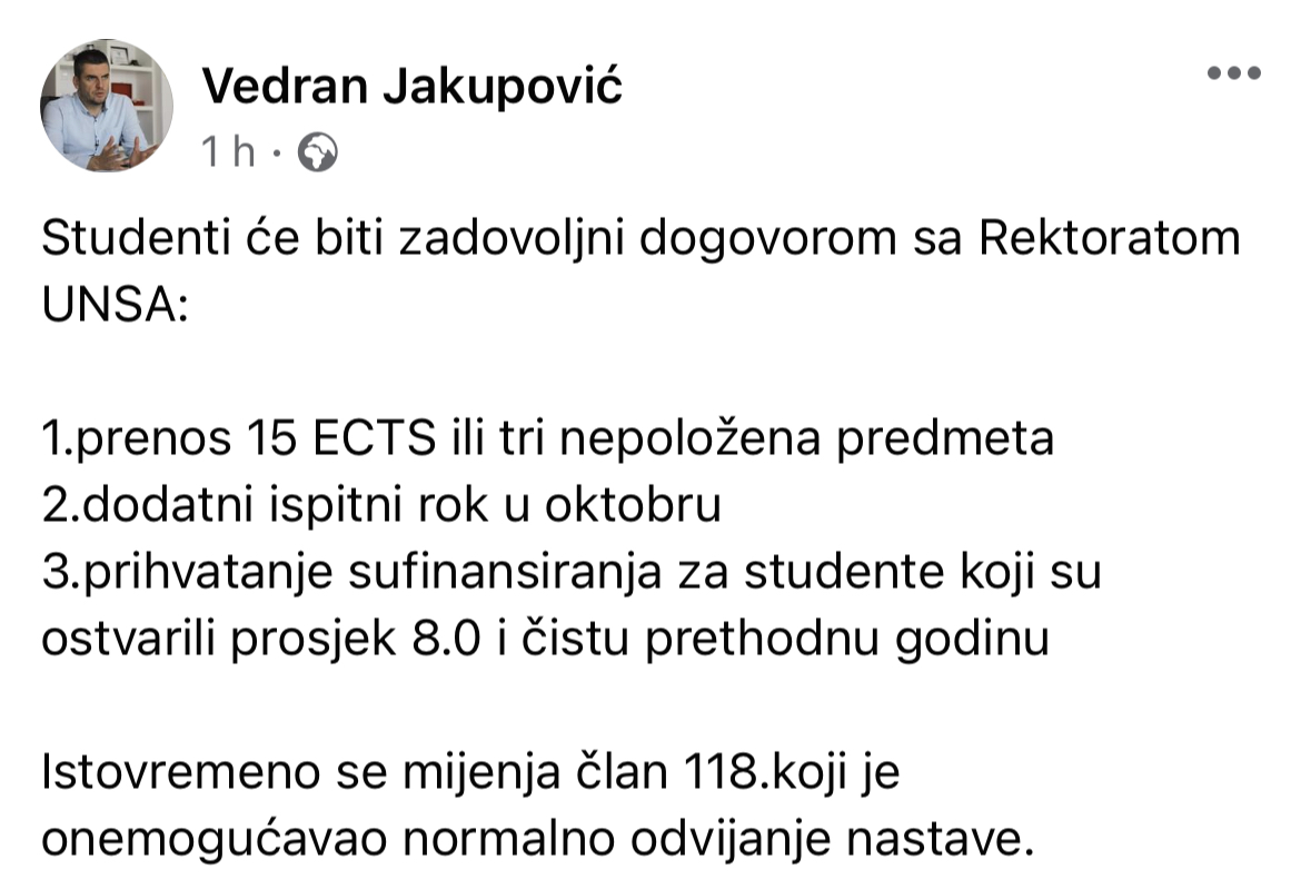 Skupština KS će sutra na hitnoj sjednici razmatrati, a siguran sam i usvojiti, izmjene Zakona kako bi se studentima UNSA omogućio dodatni rok, prenos 15 ECTS bodova, prelazak na budžet samofinansirajućih studenata sa prosjekom 8+ koji su položili sve ispite.