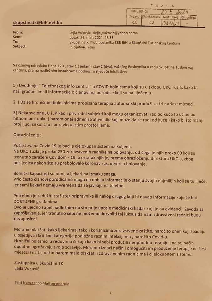 Kako je PRESS najavio dopredsjedavajuća Skupštine Tuzlanskog kantona Lejla Vuković na današnjoj sjednici podnijela je tri inicijative, a vezane za olakšanje kako ljekarima, tako i korisnicima zdravstvene zaštite, naročito onim koji spadaju u osjetljive i kritične kategorije podložne raznim infekcijama, posebno Covid-u.