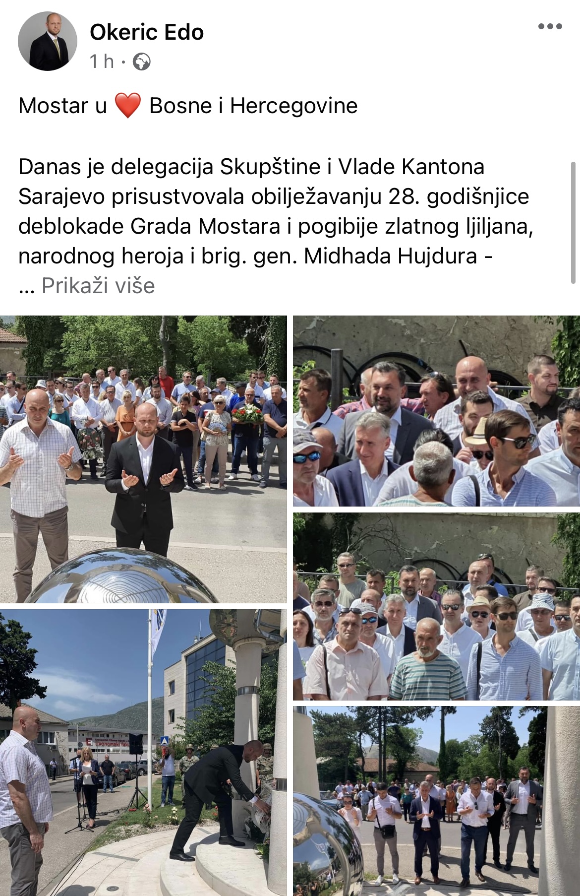Danas je delegacija Skupštine i Vlade Kantona Sarajevo danas je prisustvovala obilježavanju 28. godišnjice deblokade Grada Mostara i pogibije zlatnog ljiljana, narodnog heroja i brigadnog generala Midhada Hujdura – Hujke.
