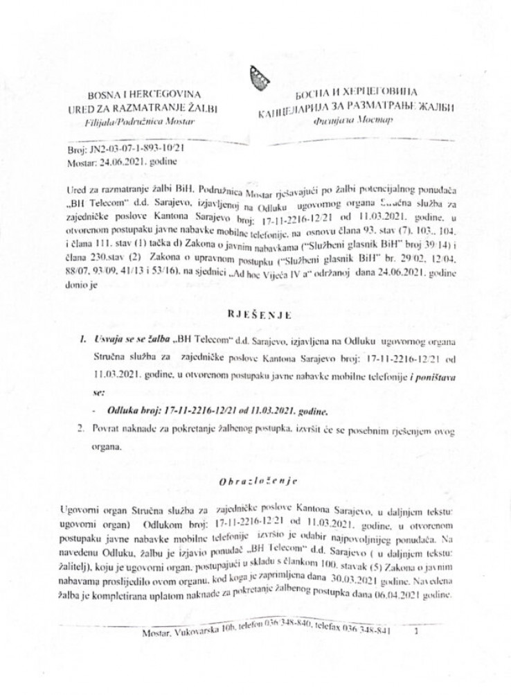 Usvaja se žalba “BH Telecoma” d. d. Sarajevo izjavljena na Odluku ugovornog organa Stručna služba za zajedničke poslove Kantona Sarajevo, u otvorenom postupku nabavke mobilne telefonije i poništava se Odluka od 11. 3. 2021. godine, piše u Rješenju Ureda za razmatranje žalbi donesenom 26. juna ove godine.