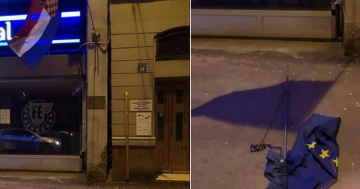 U noći sa subote na nedjelju potrgana je zastava Evropske unije, te savijeni nosači zastava na zgradi u kojoj se nalaze prostorije Konzularnog odjela Ambasade Republike Hrvatske u centru Sarajeva.Nije poznato ko je tokom noći i iz kojeg razloga, za vrijeme policijskog sata u glavnom gradu BiH, potrgao zastavu EU i bacio je na trotoar u Titovoj ulici, nedaleko od zgrade Predsjedništva BiH.