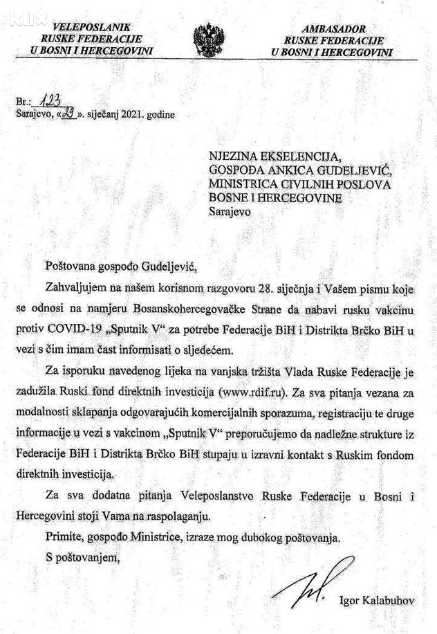 Isti zaključak, da ove zemlje vide entitete kao nivo koji treba pokrenuti direktnu nabavku vakcine, može se izvući iz dopisa koji je ruska ambasada u BiH 29. januara poslala Ministarstvu civilnih poslova BIH.