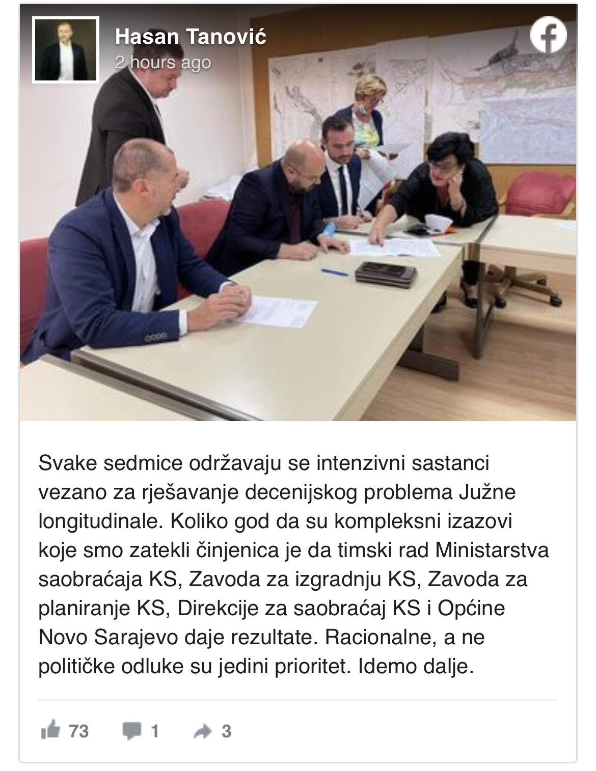Hasan Tanović, načelnik Općine Novo Sarajevo obavijestio je da se svake sedmice održavaju intenzivni sastanci vezano za rješavanje decenijskog problema Južne longitudinale.