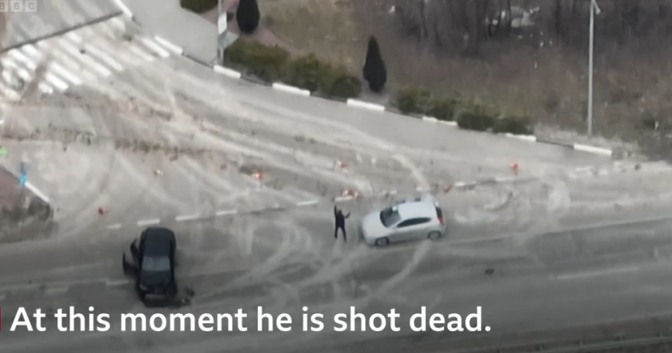 U ostacima automobila nalaze se ostaci spaljenog tijela žene. Usta su joj otvorena kao da vrišti, navodi reporter BBC-ja. Njihova smrt snimljena je 7. ožujka dronom ukrajinskih snaga. Ukrajinci su objavili snimku koju je prenio niz svjetskih medija. Snimka prikazuje hladnokrvno ubojstvo čovjeka koji je izašao iz automobila podignutih ruku – što je jasna gesta predaje.