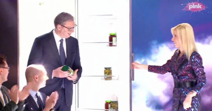 Predsjednik Srbije Aleksandar Vučić sinoć je gostovao na TV Pink sa svojim saradnicima, a u studio je ušao pravo iz frižidera.