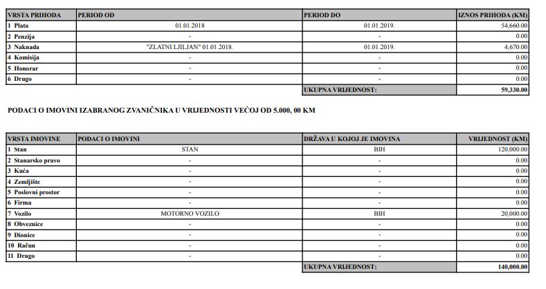 Imovinski karton Željka Komšića iz 2018. godine/ Foto: Printscreen