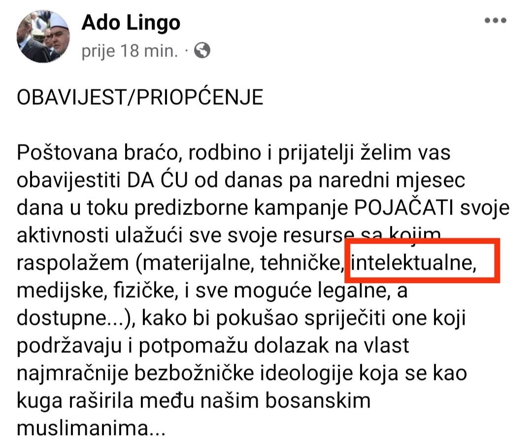 Adnan Lingo, polupismeni stranački bot u službi Bakira i Sebije Izetbegović urnebesno je najavio svoj angažman u ovoj kampanji.