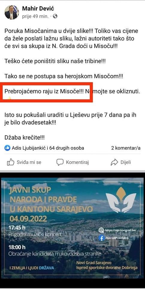 On je sa svog Facebook naloga uputio pomalo prijeteću poruku komšijama koji se odluče pojaviti na skupu u Misoči poručujući im da će ‘biti prebrojani i da paze da se ne okliznu’.