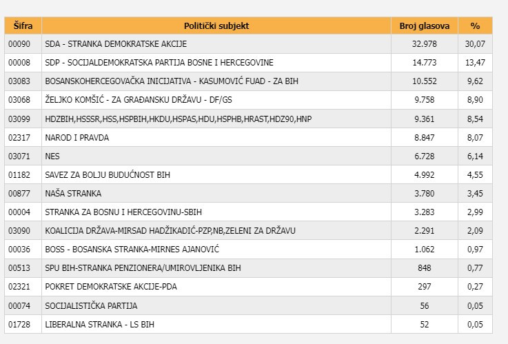 Na prvom mjestu je SDA (32.978 glasova), a na drugom SDP (14.773 glasova).