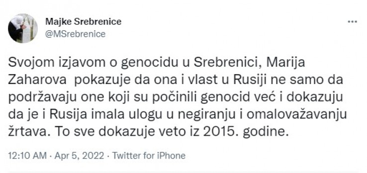 – Svojom izjavom o genocidu u Srebrenici, Marija Zaharova pokazuje da ona i vlast u Rusiji ne samo da podržavaju one koji su počinili genocid već i dokazuju da je i Rusija imala ulogu u negiranju i omalovažavanju žrtava. To sve dokazuje veto iz 2015. godine –  navele su Majke Srebrenice.
