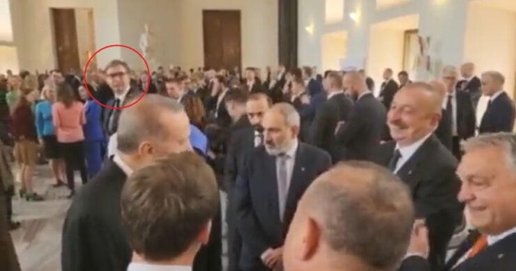 Naime, na njemu vidimo Erdogana, Orbana, Aliyeva, Macrona i druge čelnike država kako srdačno razgovaraju u holu praškog dvora, dok Vučić stoji sam, “zadubljen” u telefon, i povremeno diže glavu ne bi li ga neko primijetio.