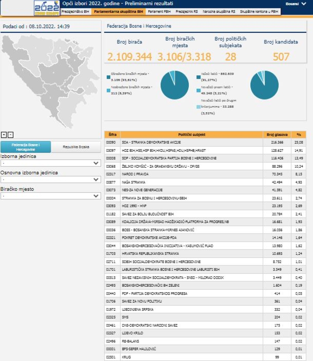 Centralna izborna komisija (CIK) Bosne i Hercegovine ažurirala je podatke preliminarnih rezultata Općih izbora održanih 2. oktobra ove godine.