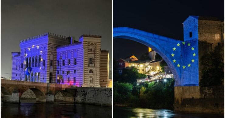 Povodom preporuke Evropske komisije da dodijeli kandidatski status Bosni i Hercegovini, sarajevska Vijećnica osvijetljena je u bojama zastave Evropske unije, kao i Stari most u Mostari i tvrđava Kastel u Banjoj Luci.