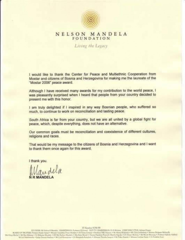 Podsjećamo, u julu 2006. godine Mandela je primio nagradu “Centra za mir i multietničku saradnju iz Mostara” – “Mostar Peace Connection”. To je jedina nagrada koju je Mandela odlučio primiti od jedne organizacije u ovom dijelu Evrope.