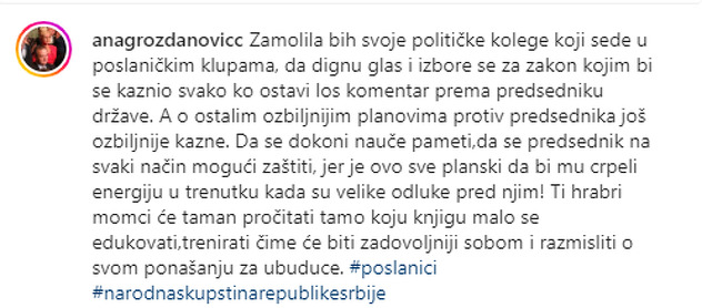 “Zamolila bi svoje političke kolege koji sjede u poslaničkim klupama da dignu glas i izbore se za zakon koji bi kažnjavao sve koji ostave loš komentar prema predsjedniku države. I za druge ozbiljnije planove protiv predsjednika, još ozbiljnije kazne”, objavila je Grozdanović na svom Instagram profilu.