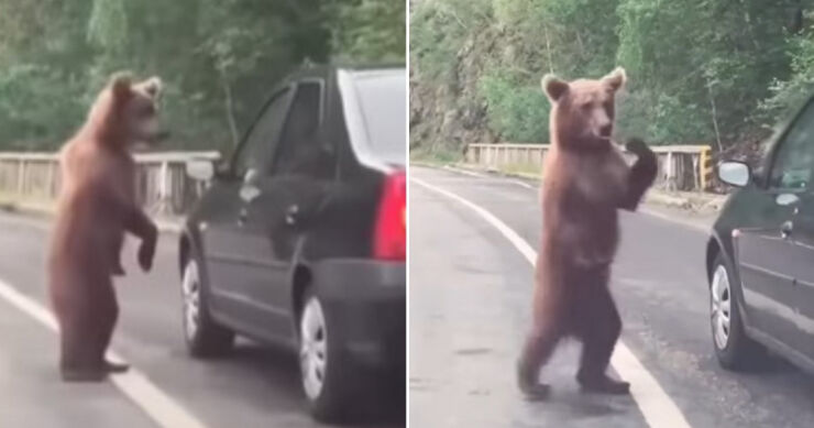 – Kreni, kreni Mladene, može da bude opasno – govorila je uzbuđeno ženska osoba u automobilu dok je nasred puta, pored drugog auta, na dvije noge stajao zbunjeni medvjed.