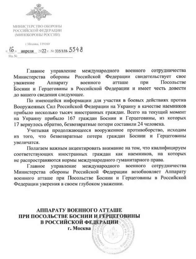 “Prema dostupnim informacija,a, nekoliko tisuća stranih državljana stiglo je u Ukrajinu kao plaćenici , kako bi sudjelovali u neprijateljstvima protiv Oružanih snaga Ruske Federacije. U Ukrajinu je do danas stiglo 167 državljana BiH, od kojih se 17 vratilo, a nenadoknadivi gubici su 24 osobe”, navedeno je u aktu.