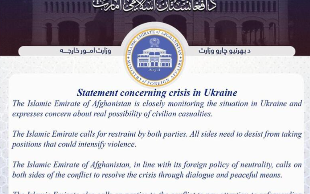Ministarstvo vanjskih poslova Afganistana saopćilo je da talibani pomno prate situaciju Rusije i Ukrajine te da su zabrinuti zbog mogućih civilnih žrtava.