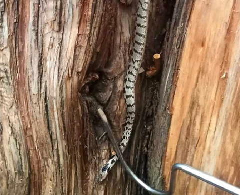 VATROGASCI iz Rovinja jučer su izvukli zmiju iz debla odrezanog stabla, koje služi kao stol u jednom parku. Naime, kako se vidi na fotografijama, zmija se uvukla među prorez debla, a vatrogasci su je pažljivo izvukli. Kažu da je to poskok.