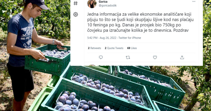 “Jedna informacija za velike ekonomske analitičare koji pljuju to što se ljudi koji skupljaju šljive kod nas plaćaju 10 feninga po kg. Danas je prosjek bio 750kg po čovjeku pa izračunajte kolika je to dnevnica. Pozdrav”, napisala je Gorica.