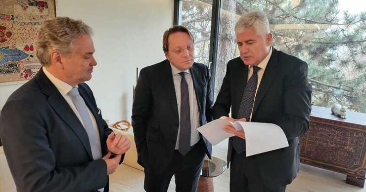 Predsjednik HDZ-a Dragan Čović danas se uoči potpisivanja sporazuma sa Osmorkom, koji definiše smjernice djelovanja mogućih budućih koalicionih partnera u vlasti, sastao sa evropskim komesarom za susjedstvo i proširenje Oliverom Varhelyijem i pokazao mu sadržaj dokumenta.