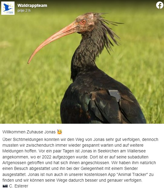 Kako je objavio Waldrappteam, organizacija koja se bavi uspostavljanjem nove divlje populacije ćelavih ibisa u Evropi, Jonas se vratio kući gdje je rođen početkom 2022. godine.