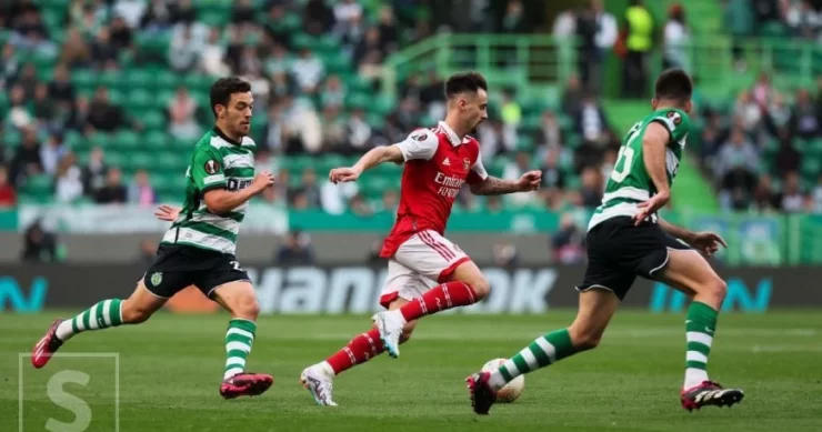 William Saliba je u 22. minuti zabio glavom za gostujuću ekipu, nakon kornera Fabia Vieire. Sebastian Coates i Oleksandr Zinchenko su u 23. požutili zbog nesportskog ponašanja. U 34. minuti, ovaj put za Portugalce, glavom pogađa Goncalo Inacio poslije kornera Marcusa Edwardsa. Gabriel Martinelli je dobio žuti karton u 43. minuti. Poluvrijeme je bilo neriješeno, 1:1.