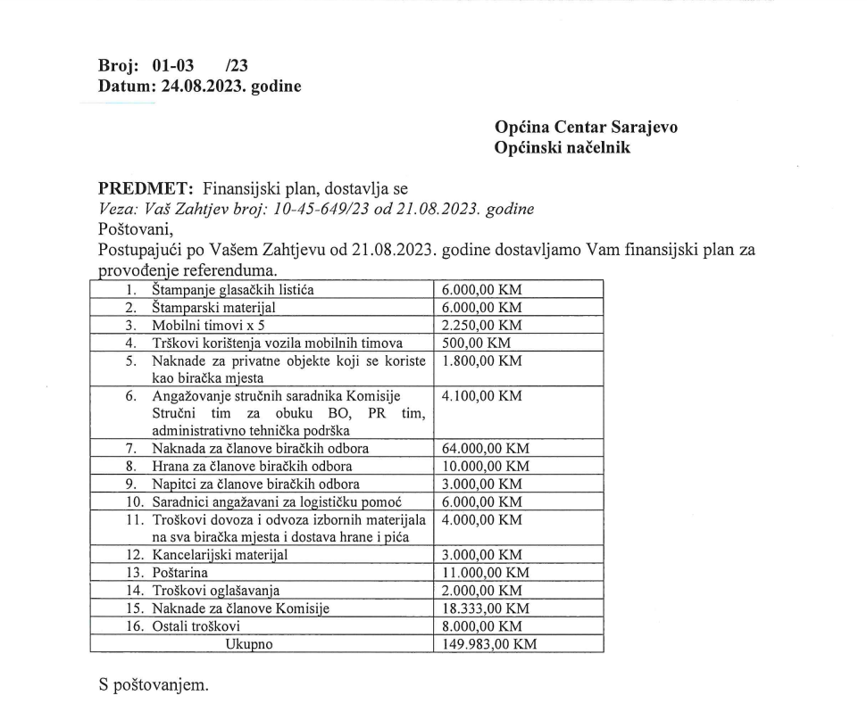 Iz njega je dalje vidljivo nekoliko čudnih stvar. Uglavnom, referendum bi građane Općine Centar trebao koštati skori 150.000 KM, a on što je čudno jesu pojedinačne stavke.