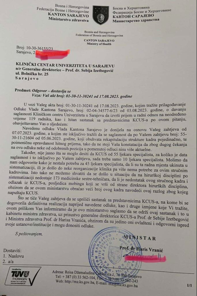 – Nakon pomne analize Odluke i konsultacija sa stručnim kolegijima klinika, došli smo do informacija da ‘tržište rada’, kao i trenutne potrebe organizacionih jedinica KCUS-a ne odgovaraju kadrovskoj strukturi koja je definirana vašom Odlukom – navodi se u dopisu kojeg potpisuje Izetbegović, zajedno sa svim šefovima disciplina na KCUS-u, a koji je objavio Raport.