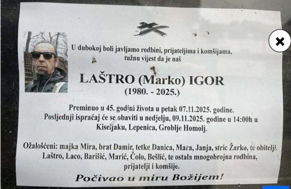 Posljednji ispraćaj obavit će se u nedjelju, 09.11.2025. godine u 14:00 sati na groblju Homolj u Lepenici, općina Kiseljak.