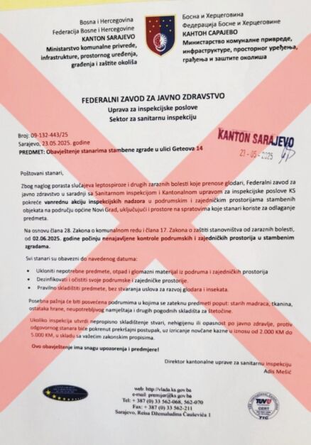 Vlada Kantona Sarajevo, Ministarstvo komunalne privrede, infrastrukture, prostornog uređenja, građenja i zaštite okoliša i Kantonalna uprava za inspekcijske poslove KS upoznati su da je u pojedinim ulazima zgrada na Alipašinom Polju postavljen dopis broj:09-132-443/25 od 23.05.2025. godine, koji sadrži nazive i oznake Ministarstva komunalne privrede KS i Federalnog zavoda za javno zdravstvo, dok su u fusnoti dokumenta navedeni kontakt podaci Kabineta premijera KS, a isti je potpisan od strane Adisa Mešića, u svojstvu “direktora kantonalne uprave za sanitarnu inspekciju”.